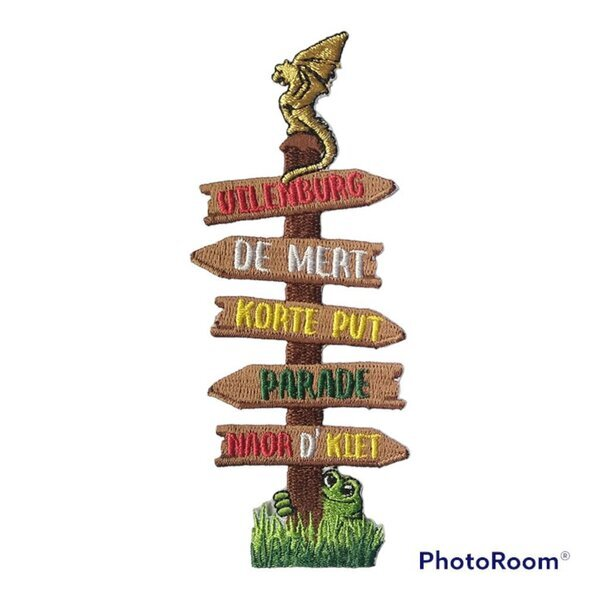 Wit-te gij de weg? Oeteldonk routewijzer strijkembleem.